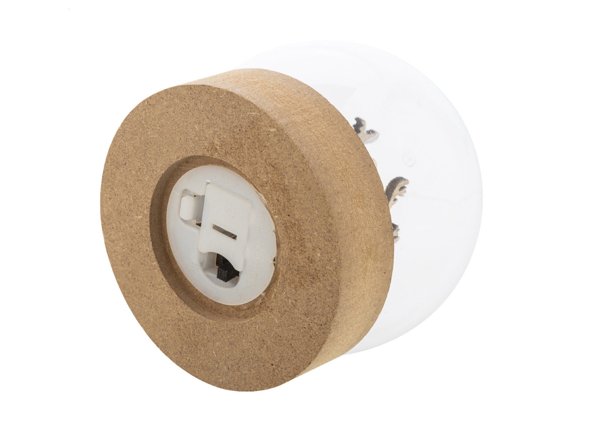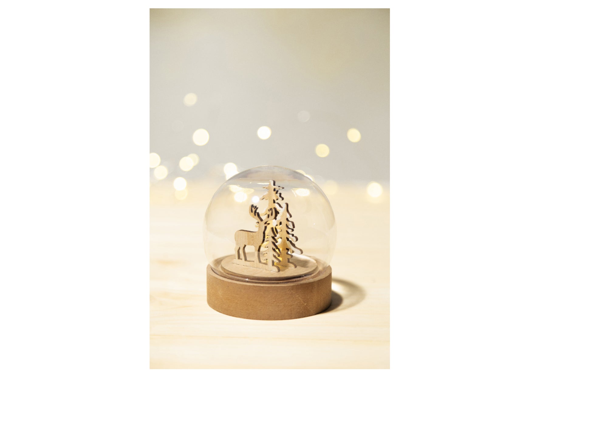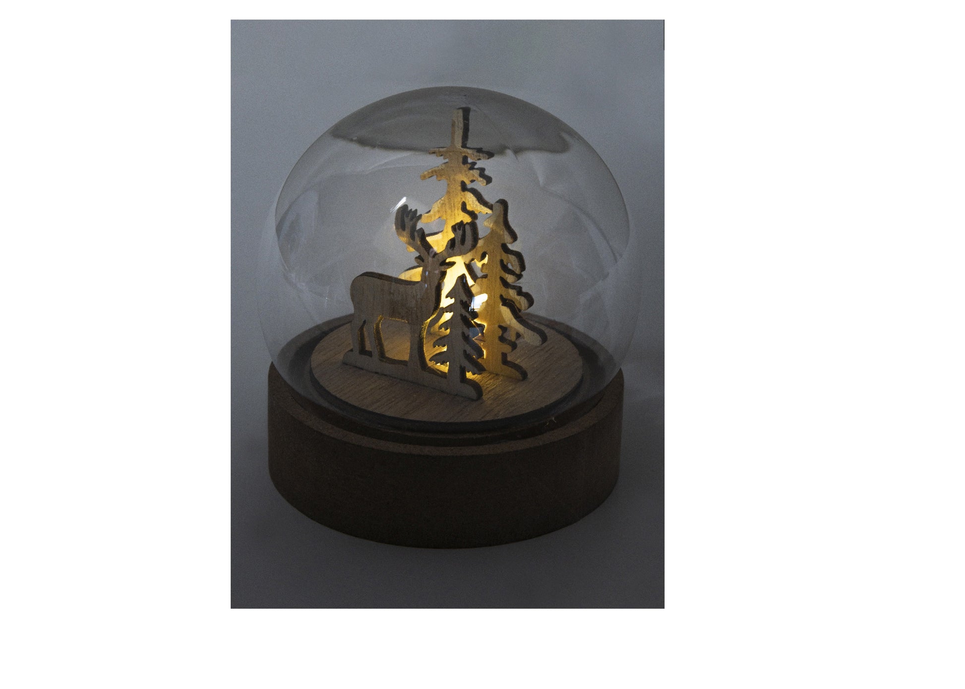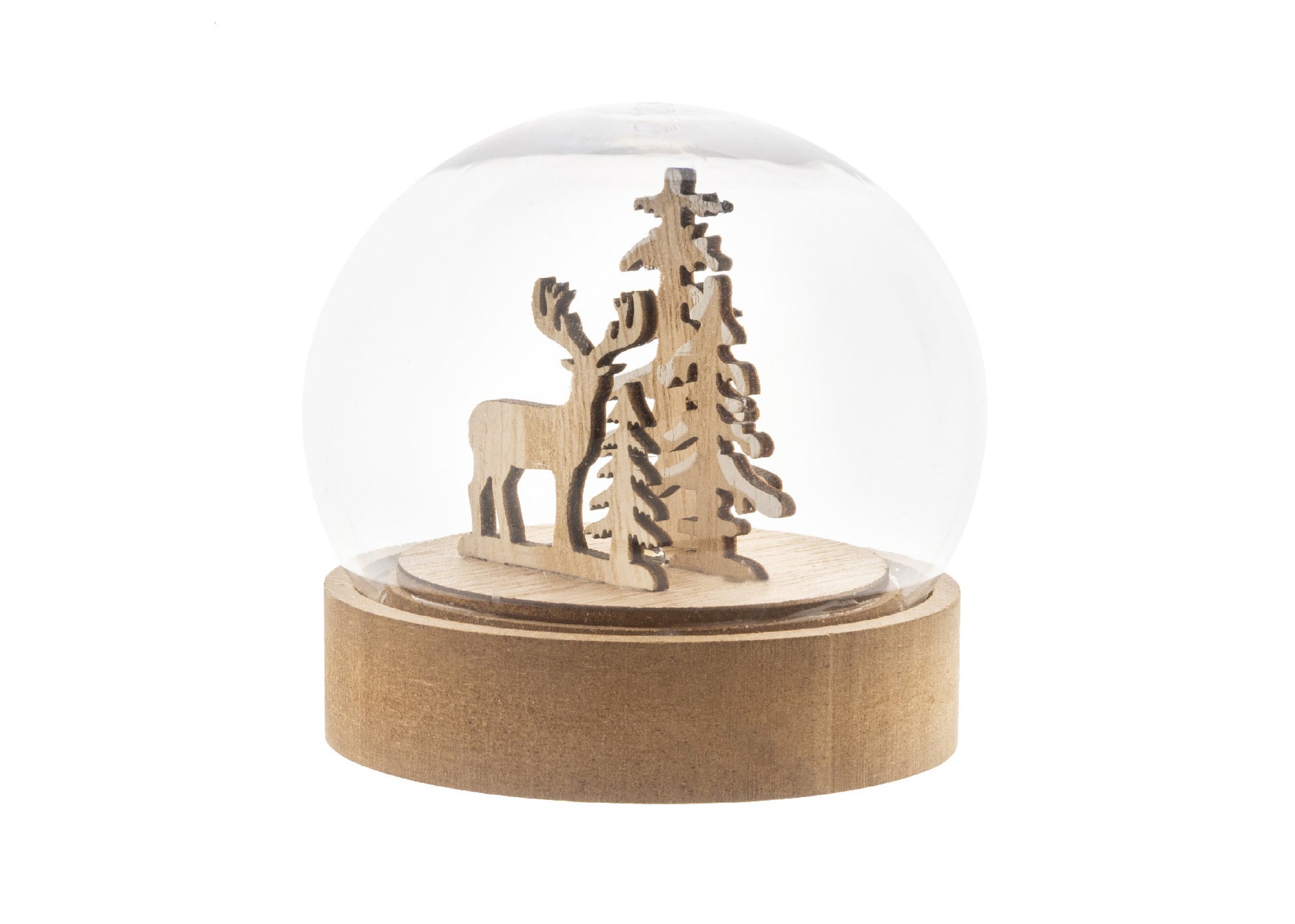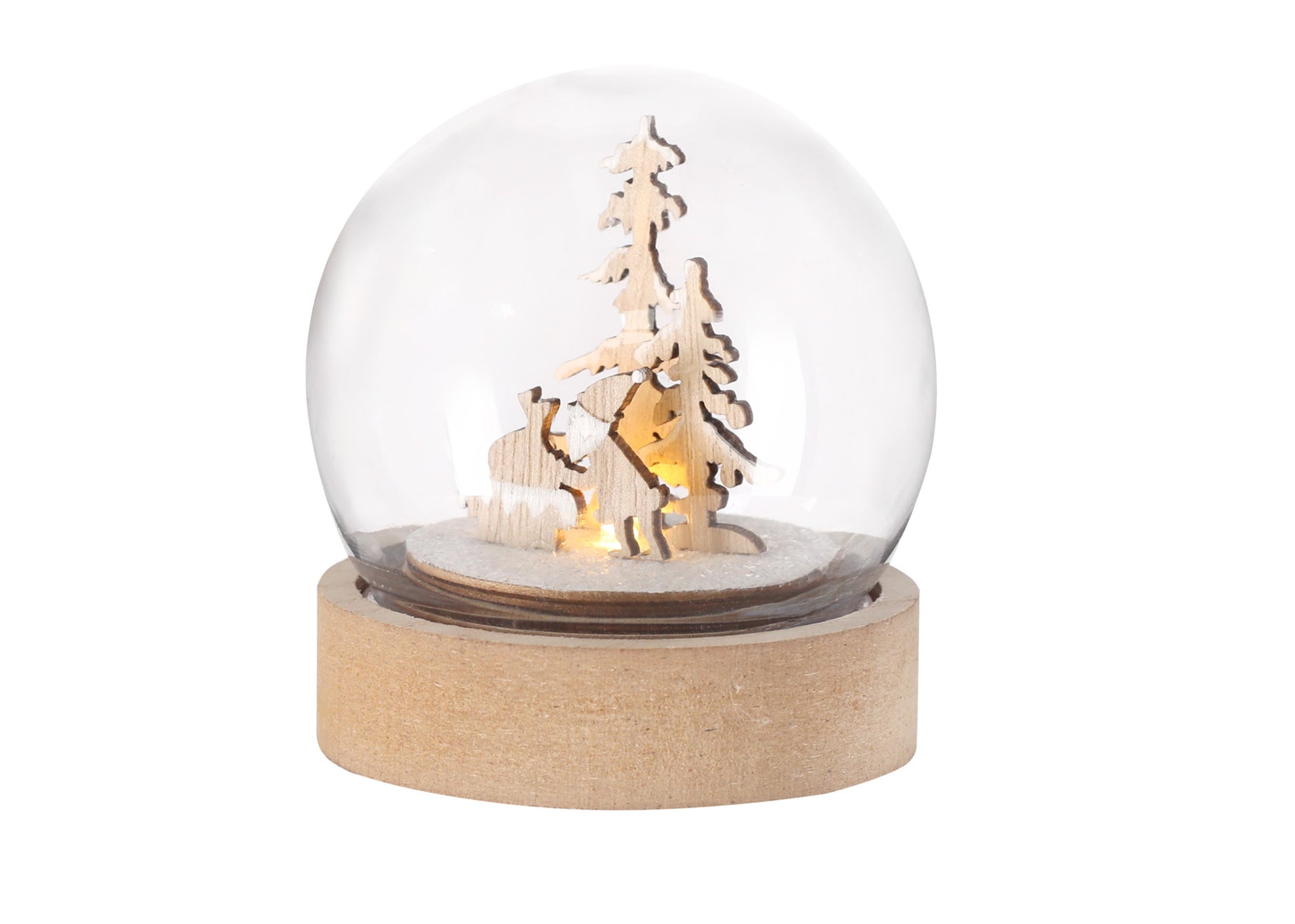 Décoration de Noël en forme de boule de neige, illuminée sur une base en bois, avec une lumière LED. Piles bouton incluses. Avec bouton ON/OFF sur la base. Marquage en gravure inclus.