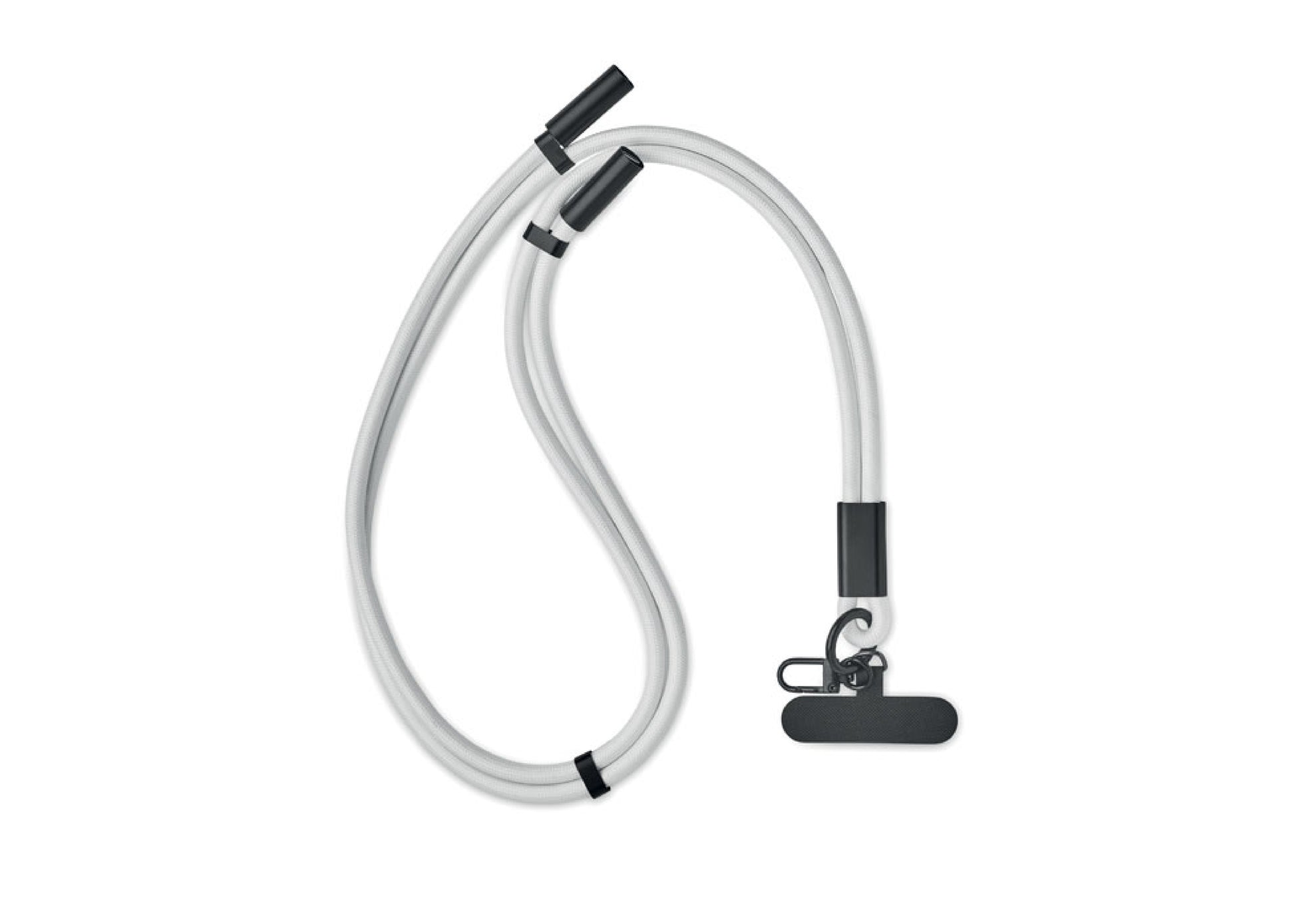 Cordon avec câble de charge et de transfert de données de 60W de type-C en RPET avec porte-cordon de téléphone et porte-clés. Marquage en tampographie en 1 couleur sur 1 position.
