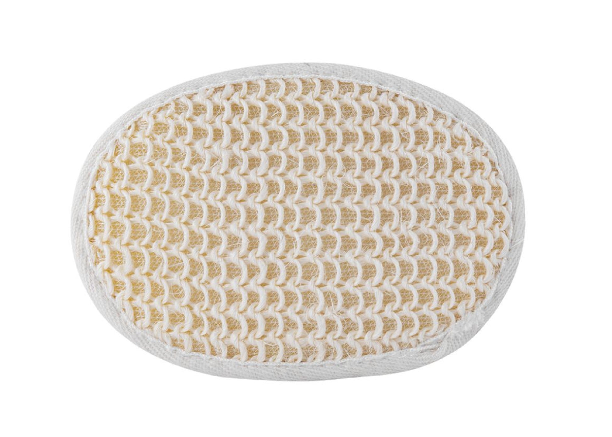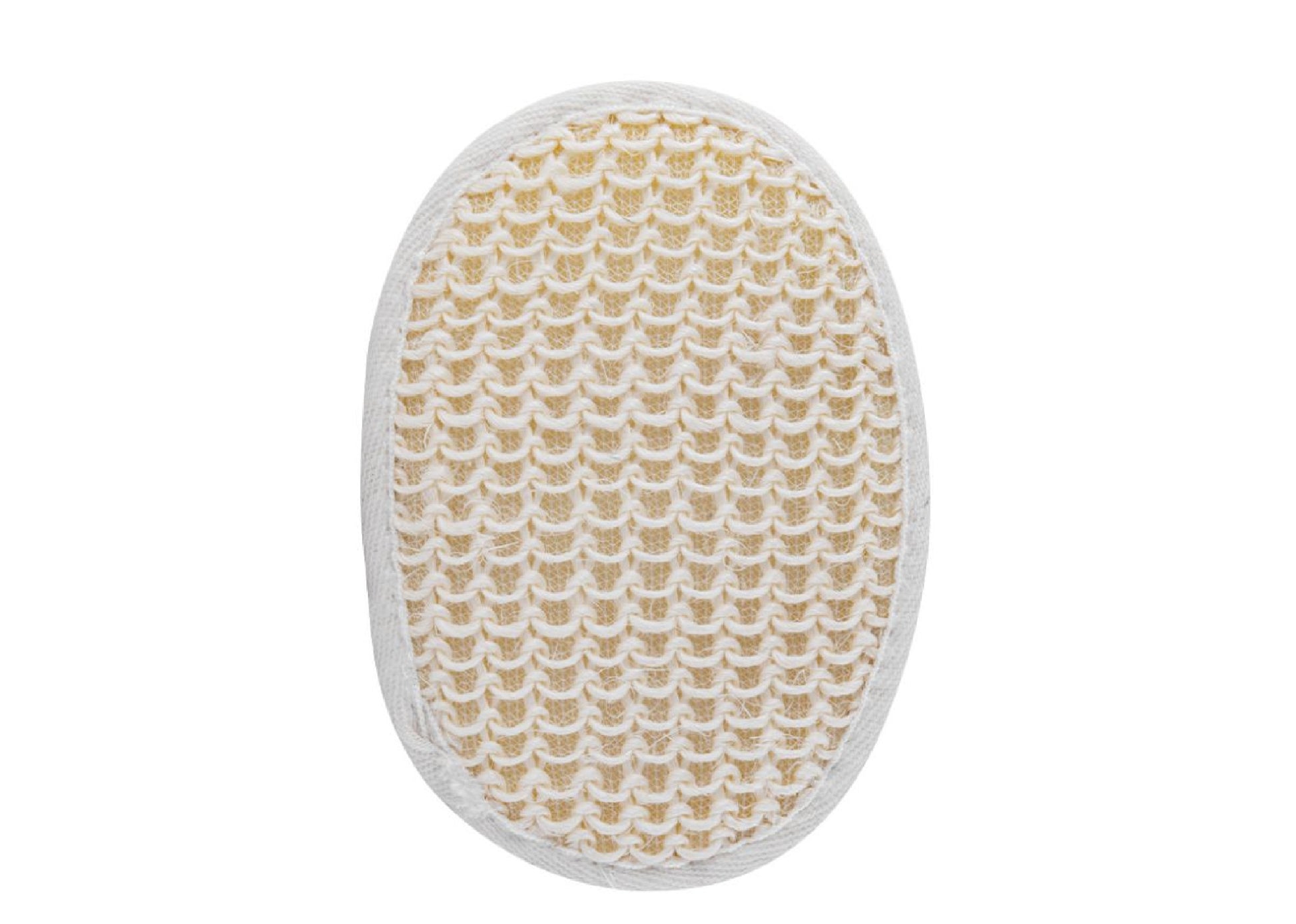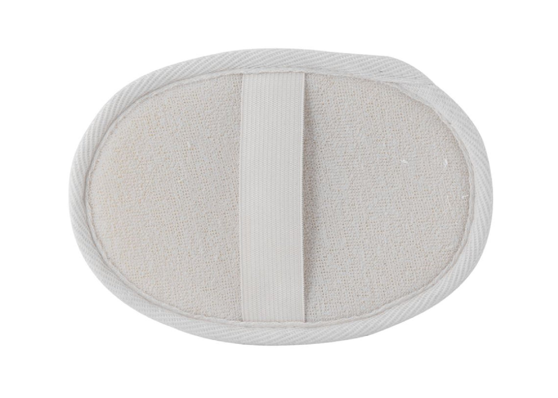 Éponge exfoliante en coton munie d'une sangle élastique afin de pouvoir la manipuler facilement.