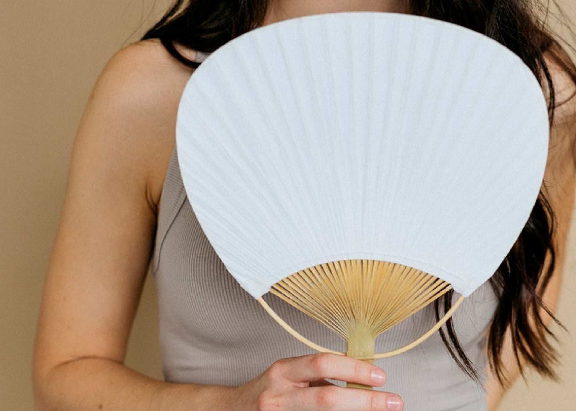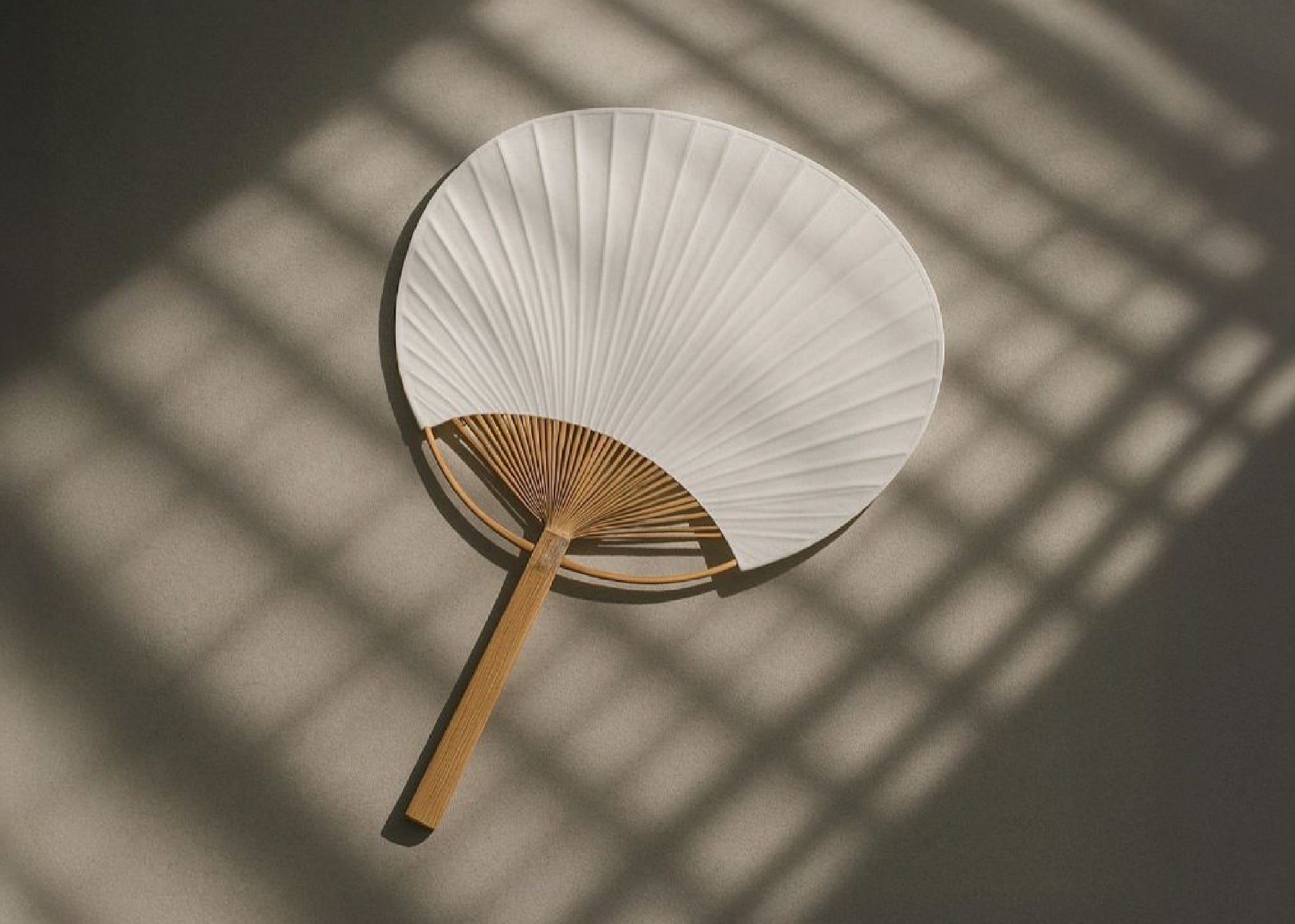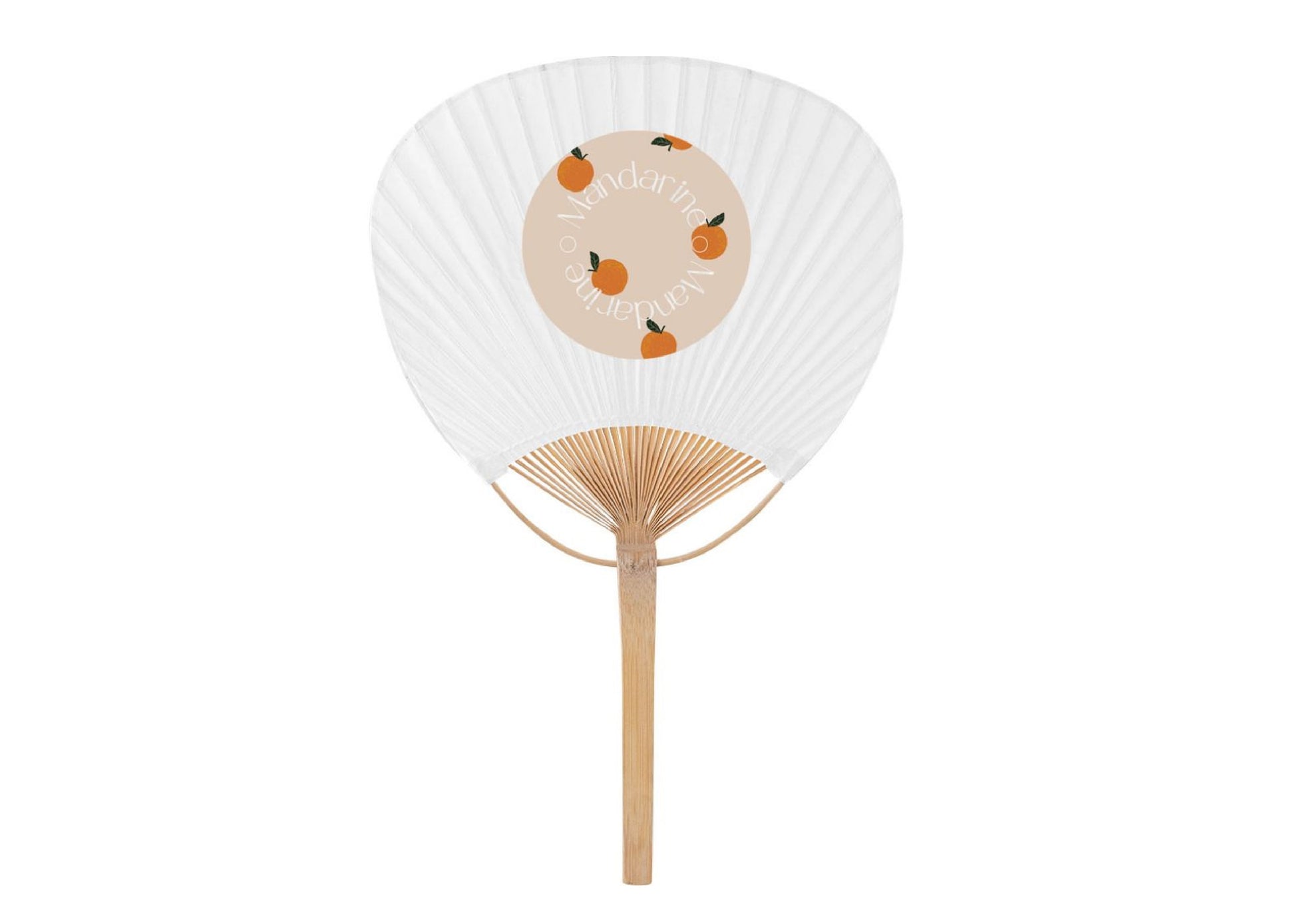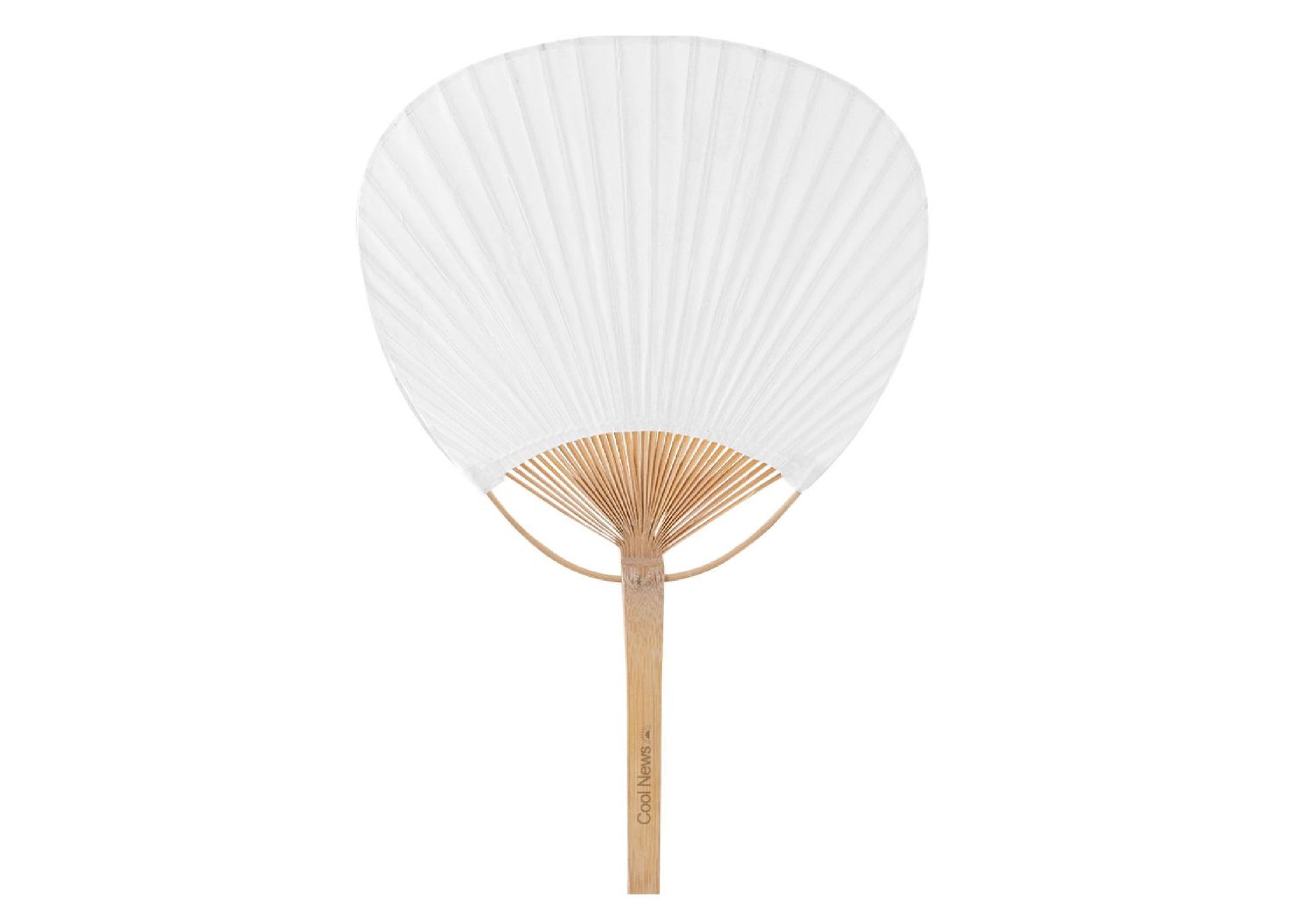 Éventail en bois avec feuille de polyester. Cet éventail comporte 14 baleines + 2 embouts.