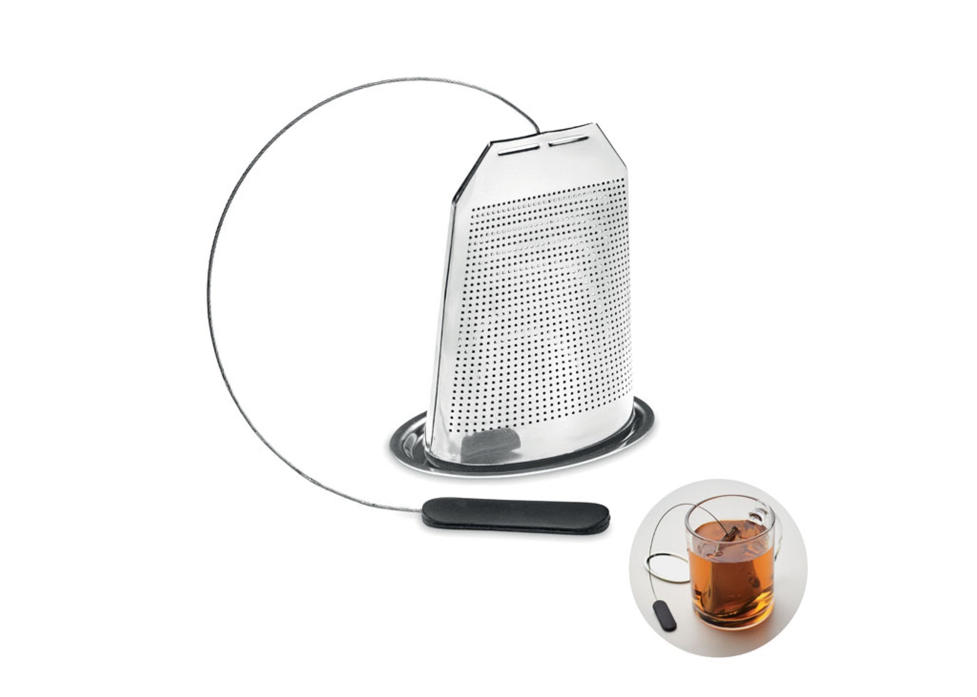 Infuseur à thé en acier inoxydable en forme de sachet de thé avec coupelle et poignée en silicone. Marquage sur la boite en sérigraphie 1 couleur sur 1 position.