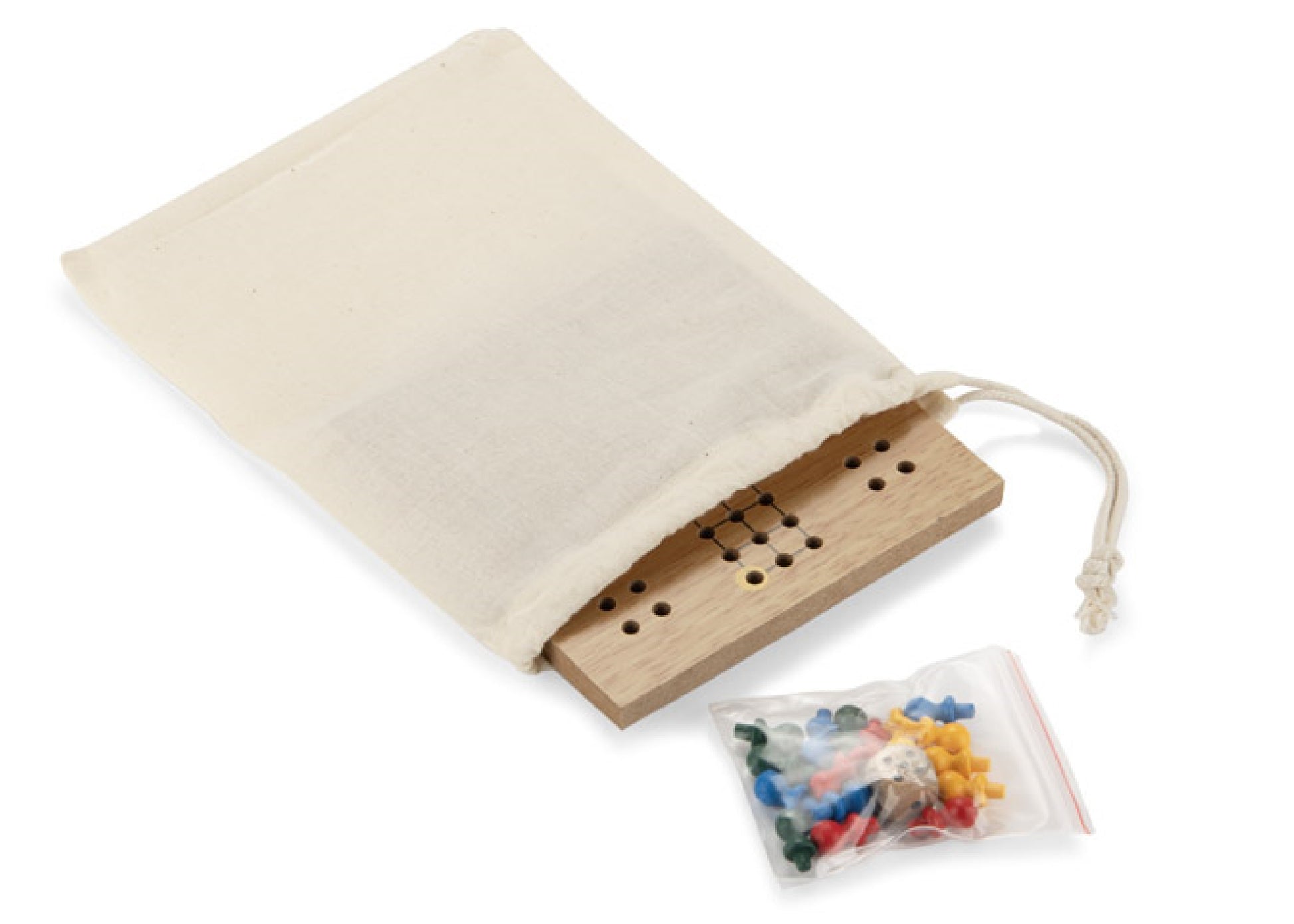 La petite version du jeu des petits chevaux. Présenté dans un sac en coton. Marquage personnalisé en sérigraphie sur la pochette en coton, en 1 couleur inclus.