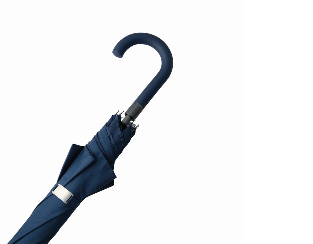 Parapluie automatique, manche en métal, baleines en fibre de verre, embouts en métal, poignée canne en gomme assortie, toile en polyester et étui gaufré, fermeture à pression avec plaque métal pour le marquage