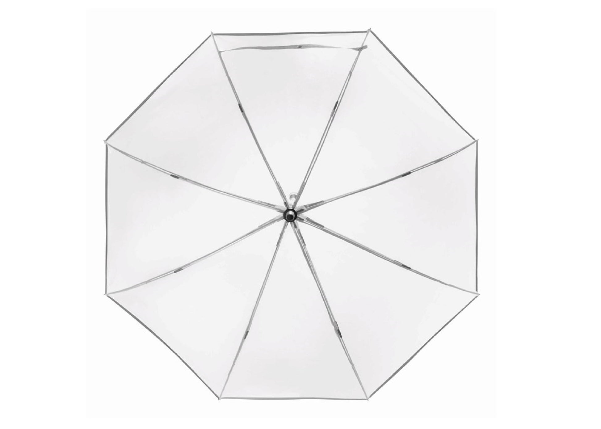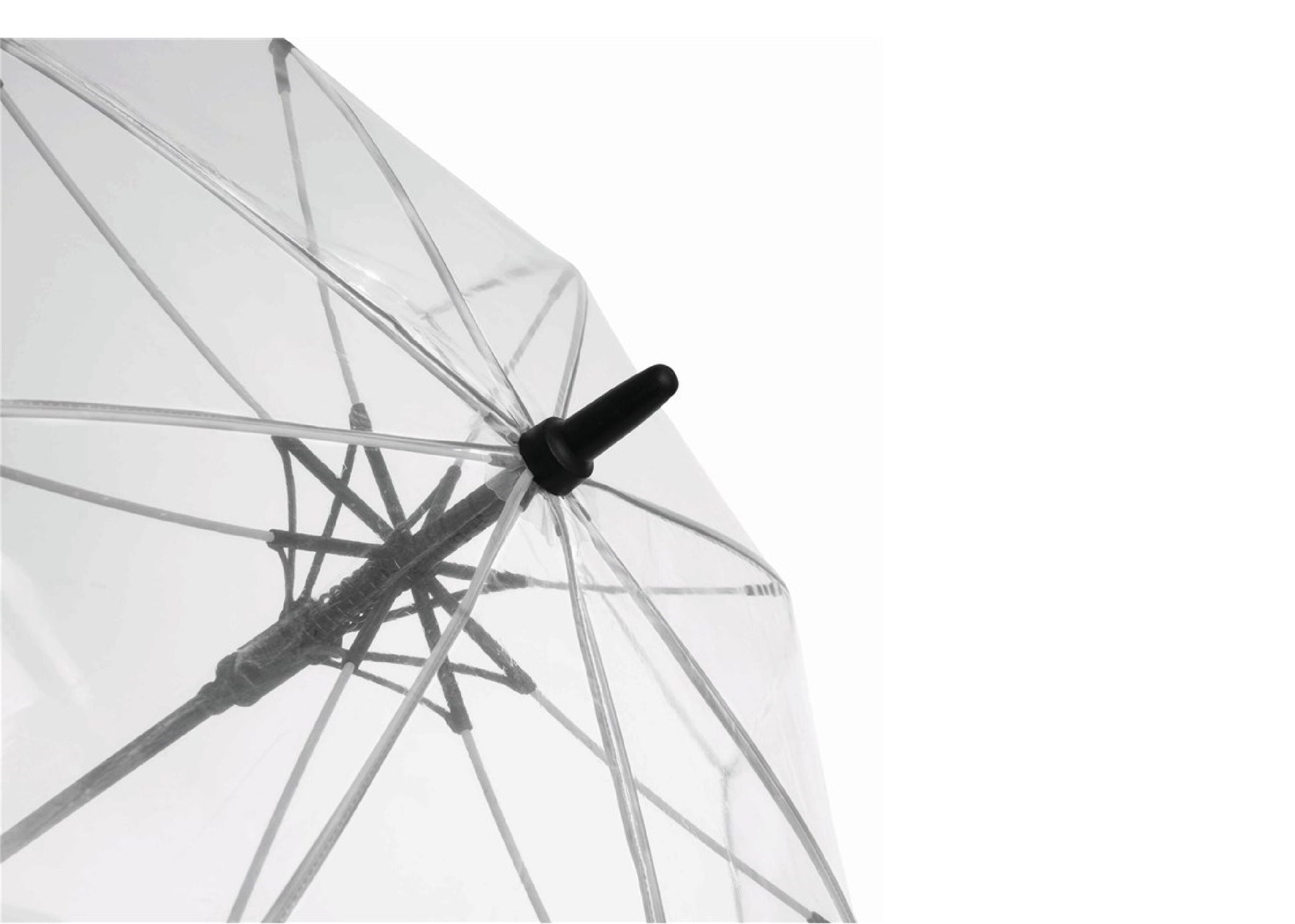 Parapluie automatique manche en métal, baleines colorés en fibre de verre avec embouts métalliques, embout en plastique, poignée en plastique avec bouton de déverrouillage intégré, couvercle en POE transparent avec passepoil coloré, bride de fermeture avec bouton.