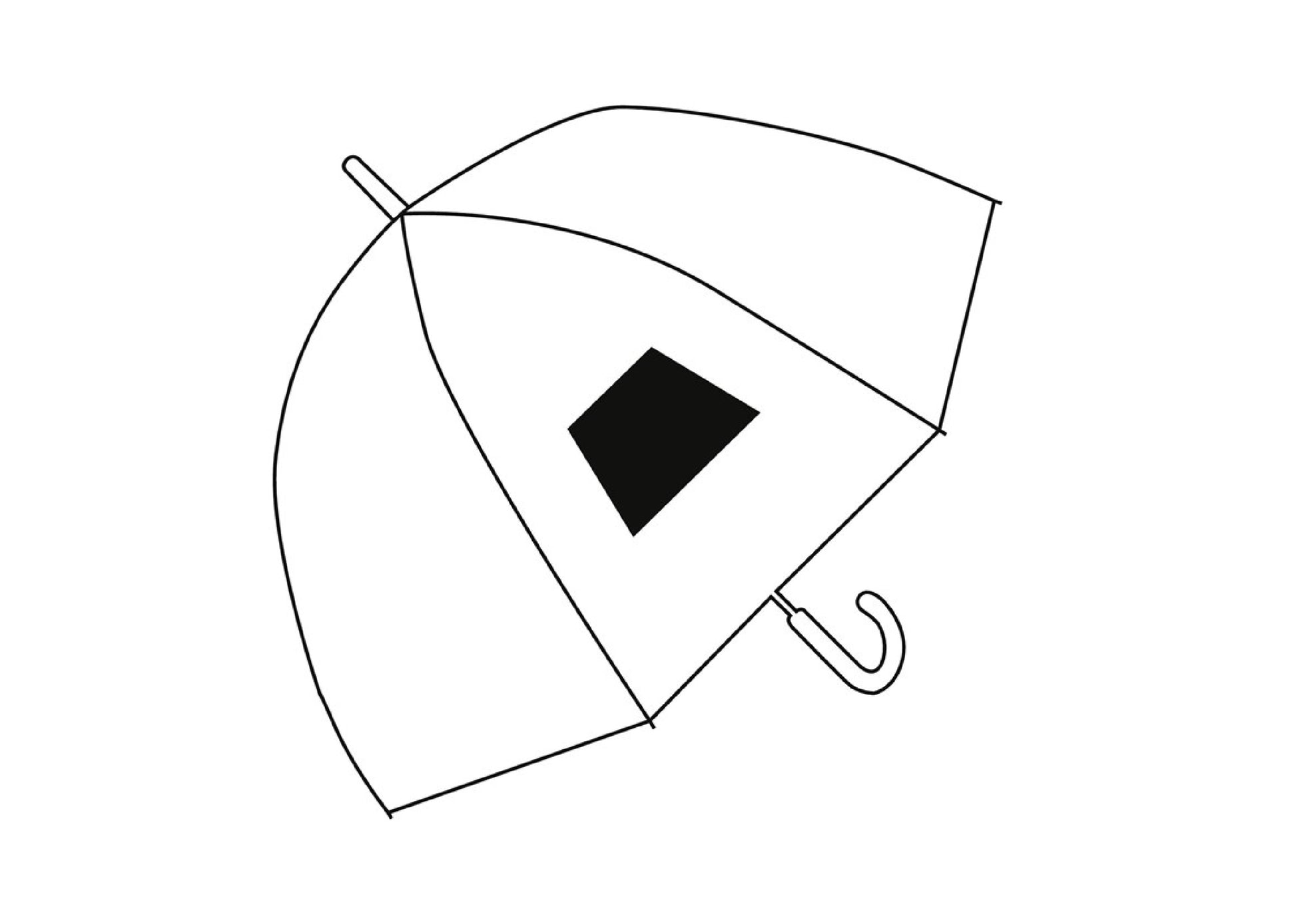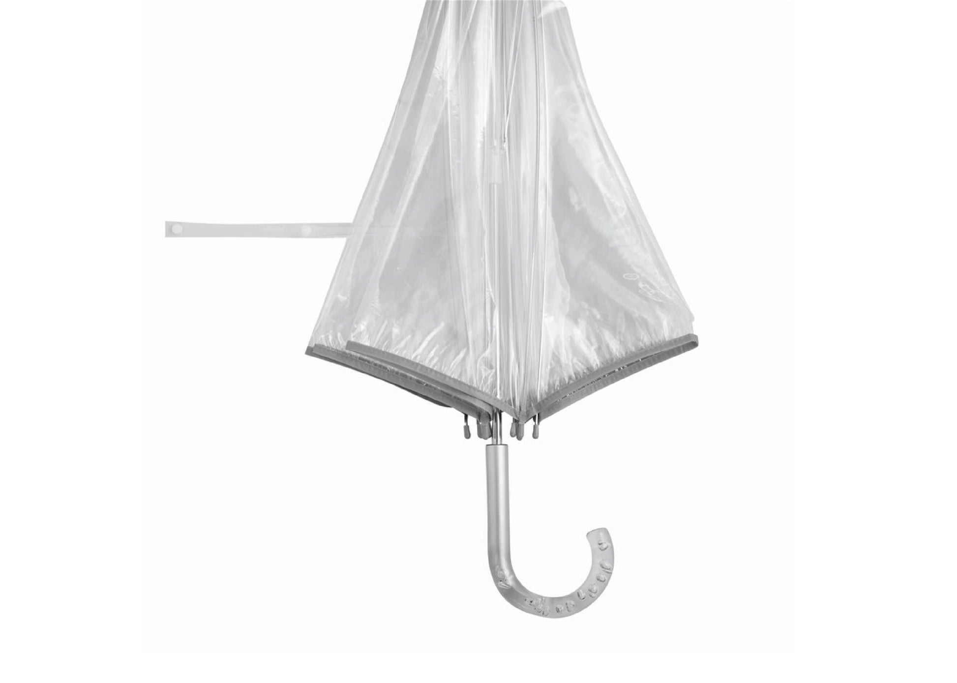 Parapluie cloche manche et baleines en métal, embouts en plastique, poignée en plastique transparent avec effet bulles d´air, toile en POE transparent avec un liseré et attache à pression argentés.