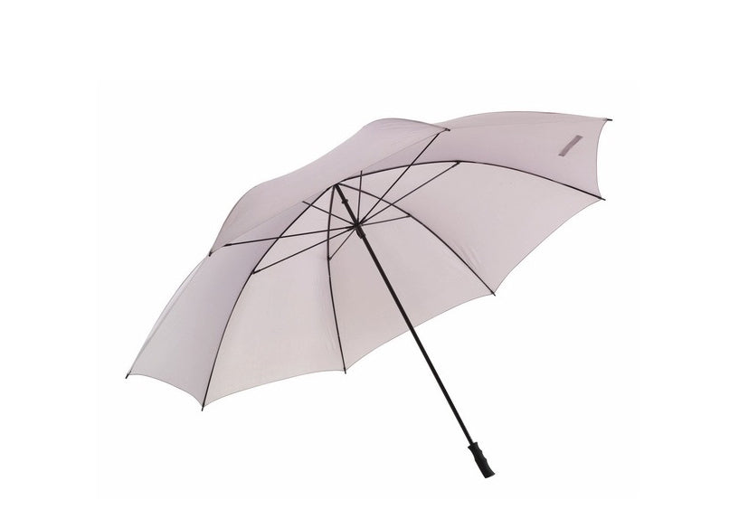 Parapluie Golf Voiturier/Concierge': Grand-diamètre de 180 cm pour plusieurs personnes, baleines et manche en fibre de verre, embouts plastique, avec sécurité de sécurité, poignée gommée, toile et housse en Polyester-Pongee, fermeture velcro.
