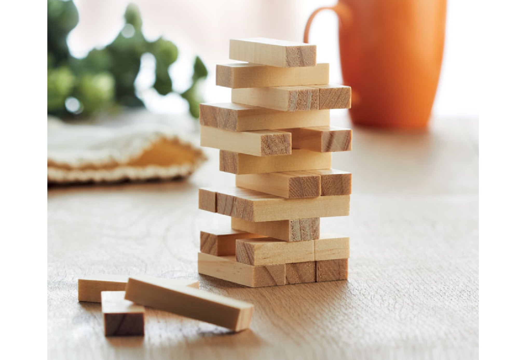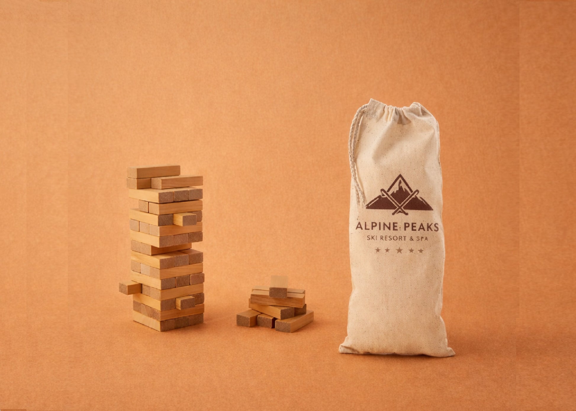 Jeu de construction de tour en bois, 54 pièces, présenté dans un sac en coton personnalisé. Marquage en transfert digital sur le devant du sac.