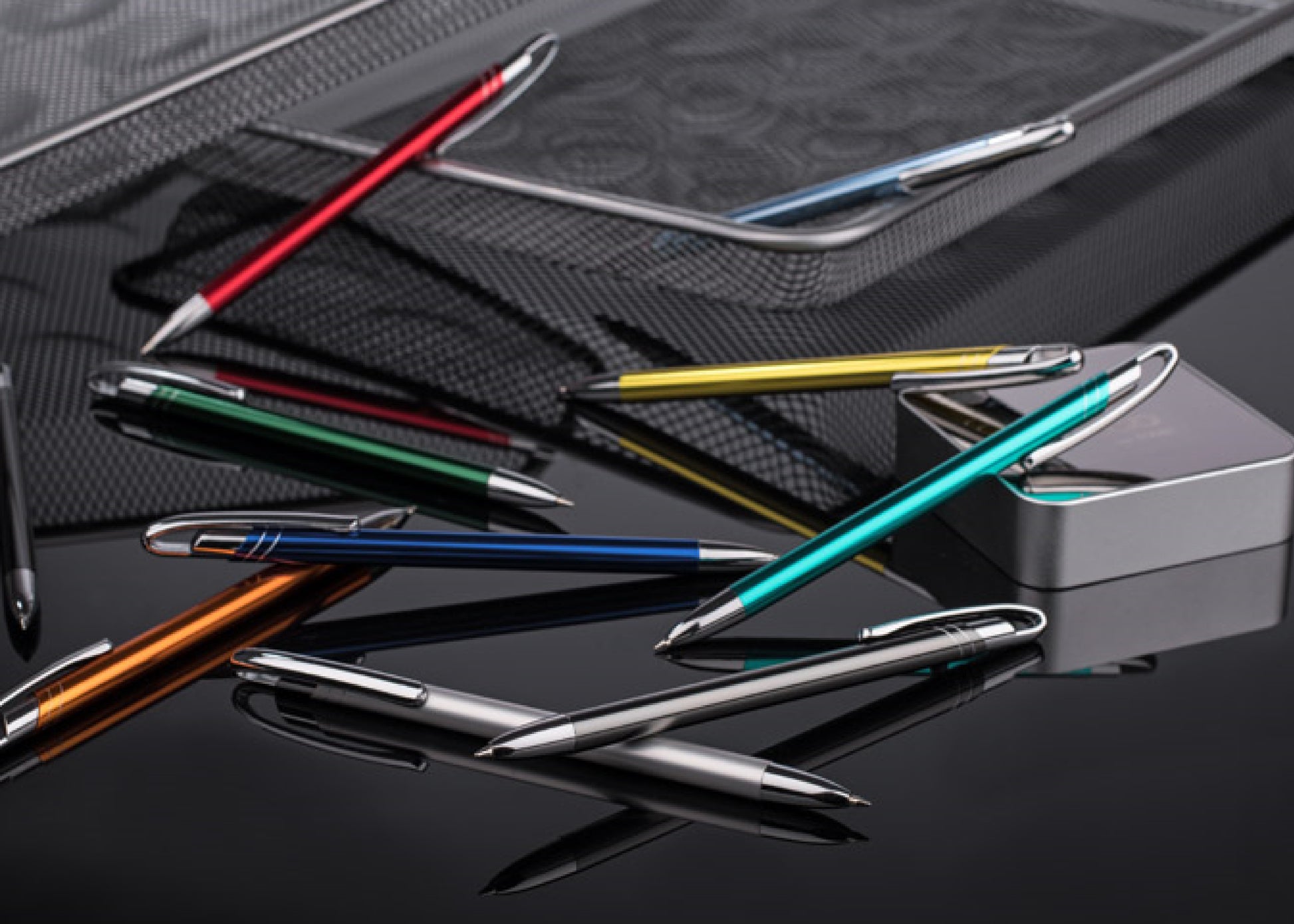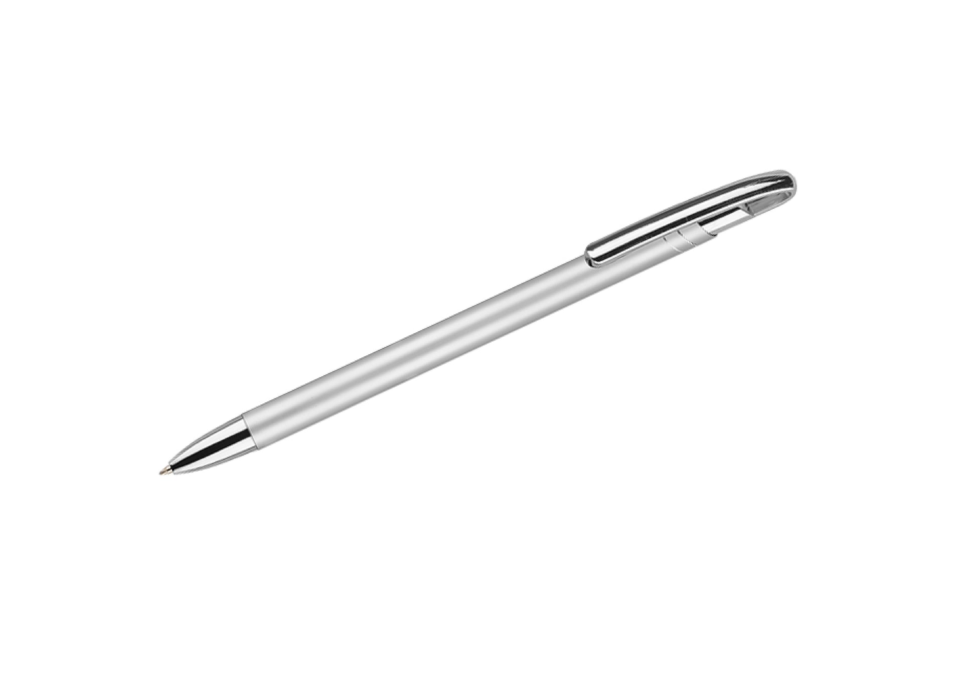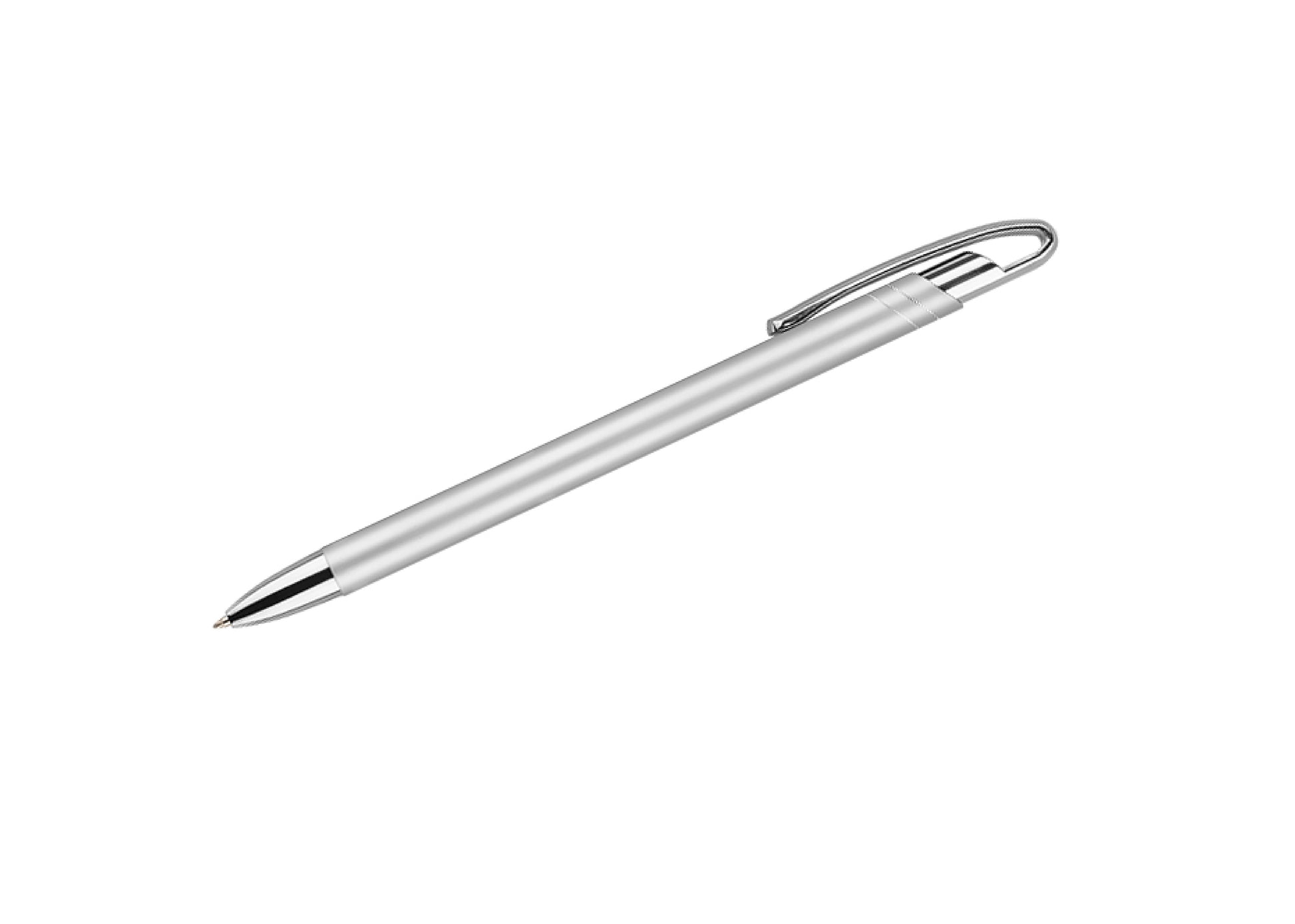 Le stylo à bille métallique fin et bien fait en couleur avec une finition métallique. Le clip et les pointes en argent chromé. Ce stylo se distingue parmi les stylos similaires par son clip du design original. Le corps est orné de deux bandes obliques d'argent. La cartouche d'une épaisseur de 0,7 mm, bleu. Marquage en gravure ou tampographie en 1 couleur sur 1 position. Plusieurs coloris disponibles.